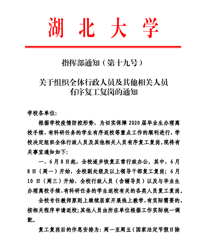 关于组织全体行政人员及其他相关人员有序复工复岗的通知(第19号)