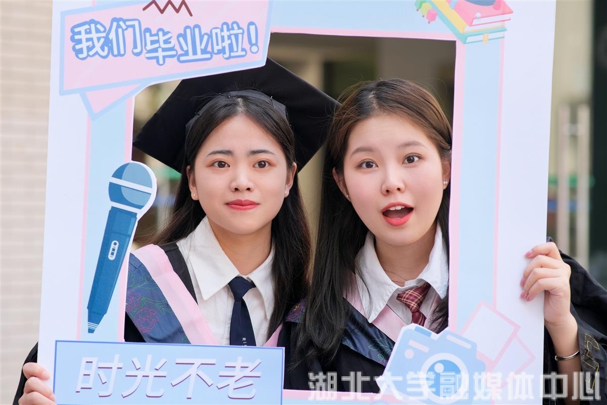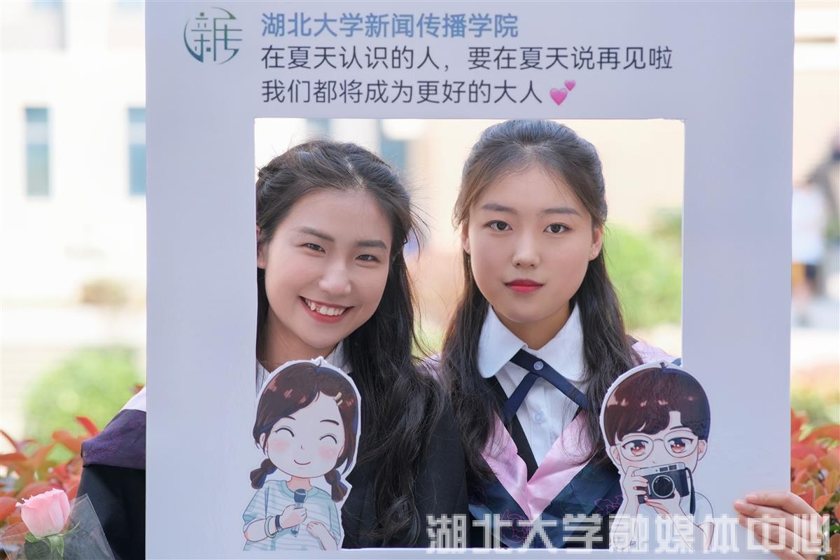 毕业生们纷纷在现场设置的打卡框合影,边框设计富有学院特点和青春气息,既有和专业相关的相机、话筒等图案,也有温馨的励志话语:“在夏天认识的人,要在夏天说再见啦!我们都将成为更好的大人。”