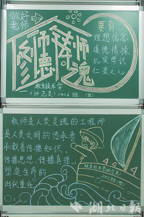 “如果教育是一艘帆船,那么教师就是船长,带领着学生们乘风破浪。”秉承这一设计理念,教育技术学(师范类)2002班在插图部分绘制了帆船和船长的图案。此外,他们还将板报的一半用来设计艺术字,并结合湖大师范学院小红楼的外观和院徽标志,纪念该校悠久的师范教育历史。