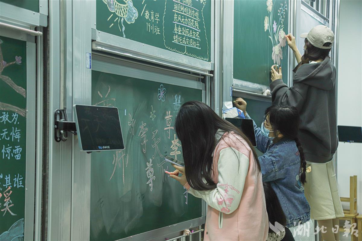 教育学2001班参赛学生在板报中介绍了“强师计划”,版面清晰美观。他们还描绘出心目中教师的模样,配以桃花图案,寓意“桃李满天下”。该班级学生裴自乐说:“希望我们都能‘桃李满天下’,成为一名优秀老师,为社会培养优秀学生。”她说,相比平时在纸上写字,粉笔字板书对控笔和排版都有更高要求,需要勤加练习。