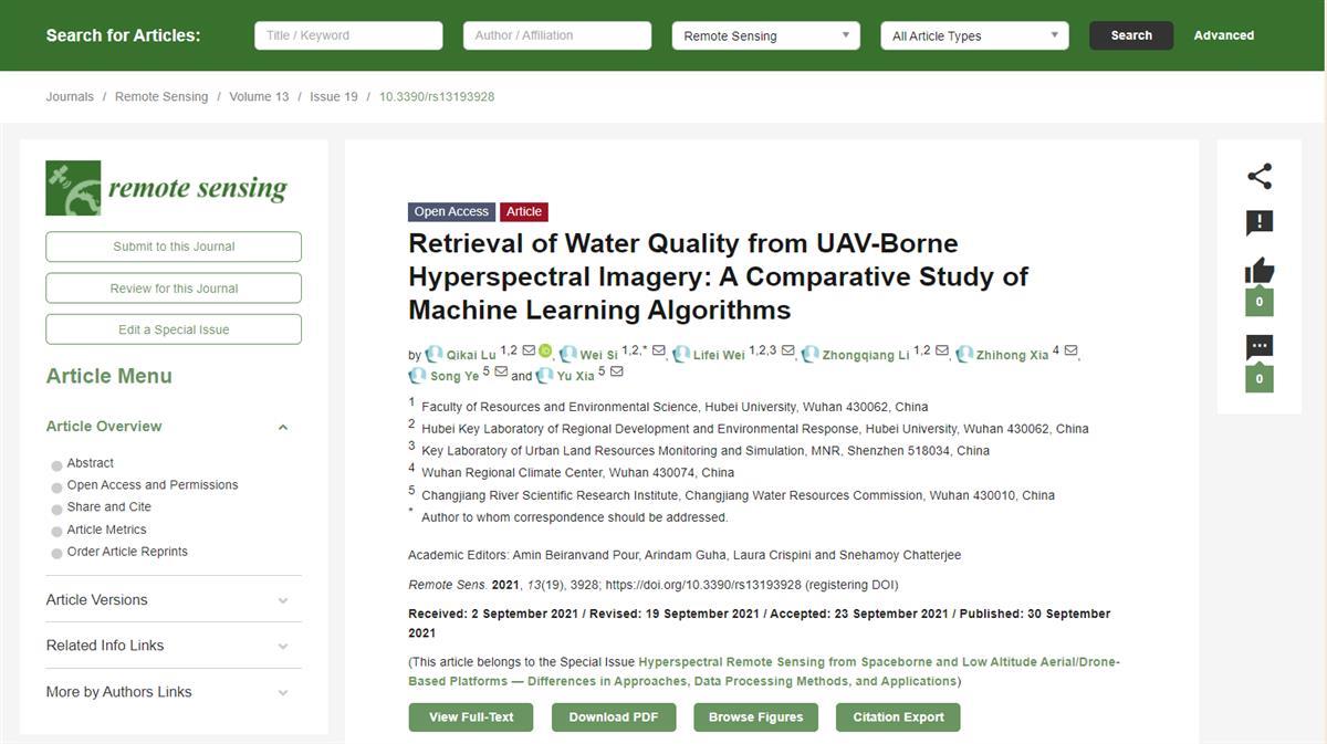从法律事务跨界地理科学,从懵懵懂懂到走入学术大门,从“论文小白”到发表第一篇SCI期刊论文……近日,在导师魏立飞副教授和卢其楷老师的指导下,国产亚洲精品久久久久久久_无码AV免费精品一区二区三区_99久久久无码国产精品免费人妻_精品人妻无码一区二区三区在线_无码专区久久综合久综合字幕_久久精品国产一区二区三区四区_真实一级一级一片免费视频_特级精品毛片免费观看_国产成人无码AA片免费看资源环境学院2019级地理信息系统专业研究生司维,以通讯作者身份在Remote Sensing(影响因子4.848的SCI二区刊物)上发表论文《Retrievals of Water Quality from UAV-Borne Hyperspectral Imagery: A Comparative Study of Machine Learning Algorithms》。这也是她硕士学业生涯中的第一篇全英论文。