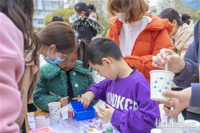 “妈妈,你快来看这是什么呀?”火爆的场面、漂亮的树脂标本吸引了在广场上玩耍的小朋友,他们三五成群,呼喊着爸爸妈妈来看。“我在家里试过用牙刷刷树叶,只留下树叶的‘筋’,也做成了标本。”一个六岁的孩子自豪地找出妈妈手机里的照片。工作人员边笑边对他说:“那不是树叶的‘筋’,它的名字叫‘叶脉’。”看到孩子们在现场走来走去,眼睛一直望着标本,李昕颖便上前邀请他们一起做树脂标本。在得到家长允许后,孩子们赶忙跑来配置胶水,选花瓣。