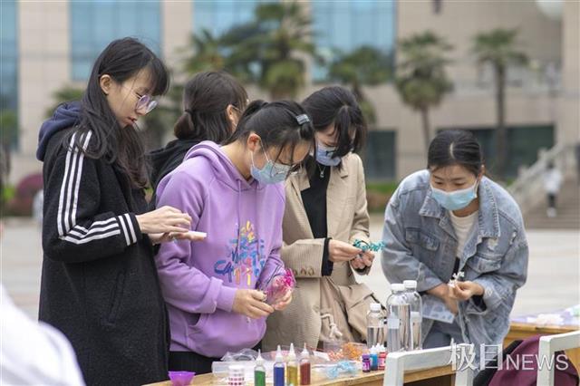 两种高清硬胶在电子秤上按照比例搅拌均匀,再倒入提前拾取的樱花,用搅拌棍小心摆放……2019级汉语言文学国家基地班的刘柯莹在工作人员的指导下,顺利完成了自己的第一次尝试,“通过这个活动把春季的樱花留住,很有意义。”