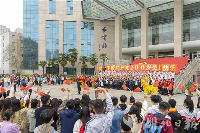 党史专家、75岁的田子渝教授参与快闪活动。他感慨地说:“中华民族站起来、富起来、强起来,这一切都是中国共产党带领中国人民奋斗百年得来的。青年大学生应该对当今中国的成就感到无比光荣与自豪,更应该铭记党的历史,明白自己‘从哪里来,要到哪里去’。”