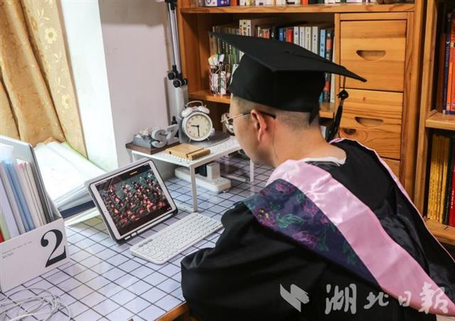 当天未能来到毕业典礼现场的毕业生,纷纷在屏幕前留言。该校新闻传播学院毕业生邵壮穿着学院发的学士服,在安徽淮南的家中参加了“云典礼”。邵壮说:“毕业是离别,也是一个新的开始。愿我们的未来,直挂云帆,乘风破浪。”