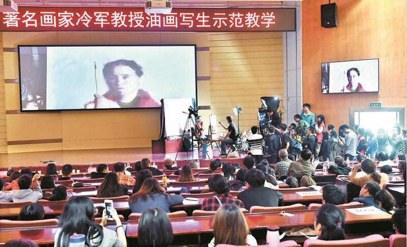 画模特眼睛时,冷军多次退远看画并叮嘱学生们:“绘画局部不能脱离整体,每画一个局部都要观照整体。”而提到自己喜欢用扇形笔,冷军则分享道:“宁可用大笔画小画,不要用小笔画大画。”“现场细致的示范教学,加以专业基础知识的介绍,这七个小时我觉得受益匪浅。”2015级艺术学院学生彭玉蝶说。