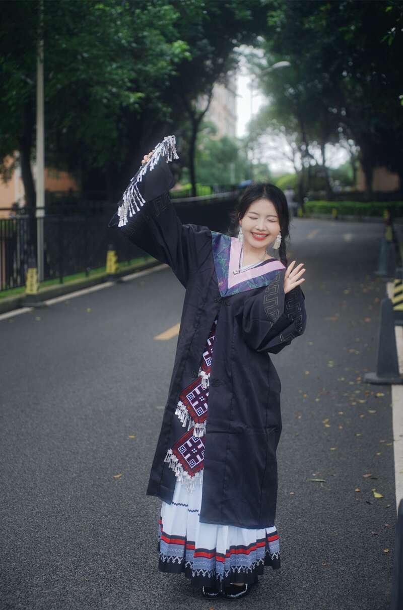 2024年6月15日,阳光学院2024届毕业生王雪莲同学将苗族特色服饰与学士服结合,在校园里拍照留念。