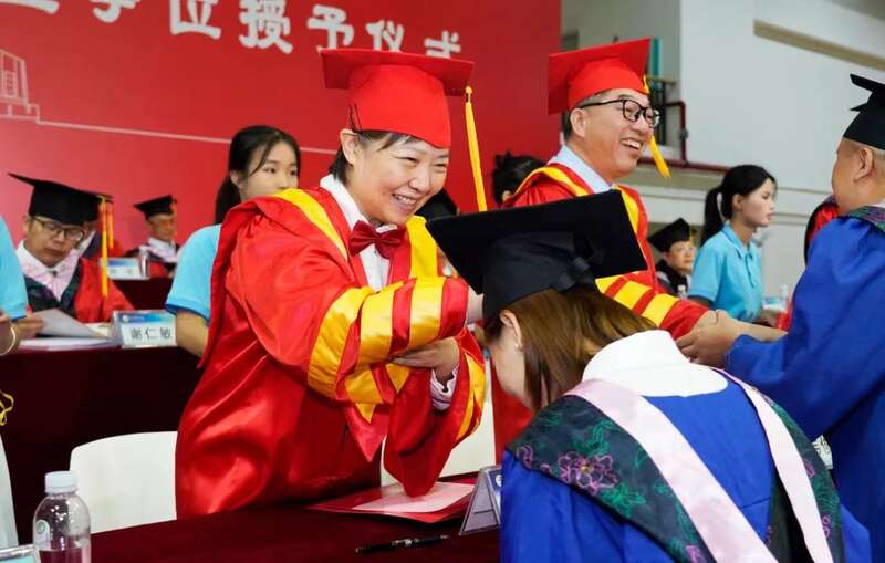 6月24日,在广西艺术学院2024届毕业典礼暨学位授予仪式上,广西艺术学院党委书记查丹明和校长韦俊平为毕业生拨穗。广西艺术学院供图
